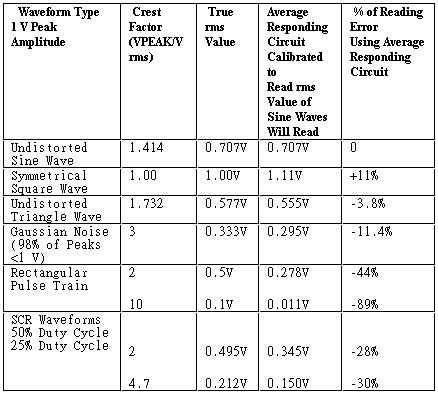As an example, if an average responding converter is calibrated to measure the rms value of sine-wave voltages, and then is used to measure either symmetrical square waves or dc voltages, the converter will have a computational error 11% (of reading) higher than the true rms value (see Table I ).